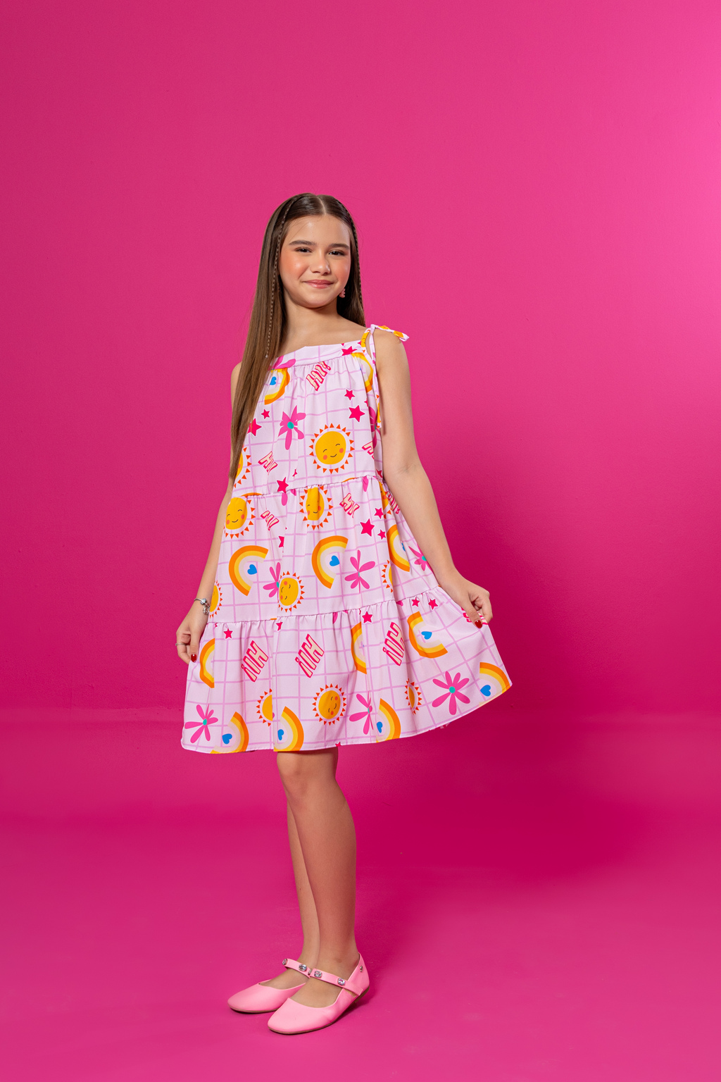 O destaque da peça é sua estampa encantadora e lúdica em um fundo azul vibrante, com elementos como flores cor-de-rosa e arco-íris, criando um visual único e cheio de personalidade. O modelo rodado confere um movimento gracioso ao vestido com amarração nos ombros, deixando o modelo bem soltinho.